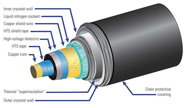 This technology was adapted to create high voltage transmission lines. These cables are made up of a copper core, cooled by a liquid nitrogen coolant and electrically insulated by a dielectric. They have extremely low impedances, and thus lower power losses and less strict siting(geographic) requirements.